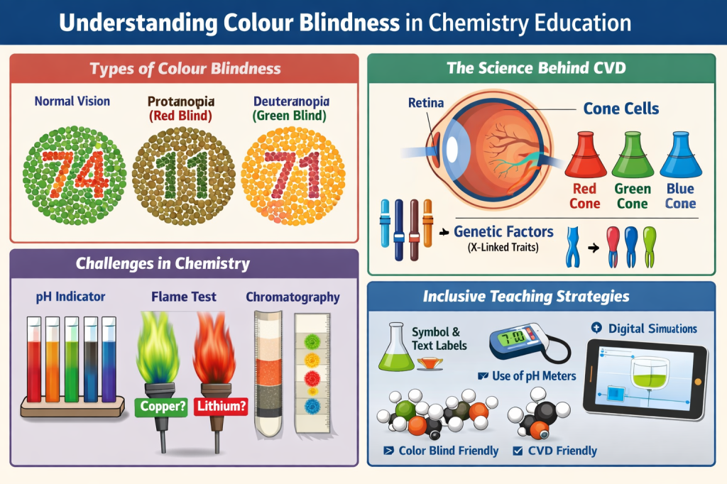 Colour blindness, more accurately termed colour vision deficiency (CVD), is a largely invisible factor in chemistry education. It rarely features in curriculum documents, is seldom discussed in teacher training, and is often mistaken for carelessness when manifested in assessments. However, chemistry, more than many other school subjects, is deeply colour-dependent. Ignoring this reality is not a tradition; it is an oversight.