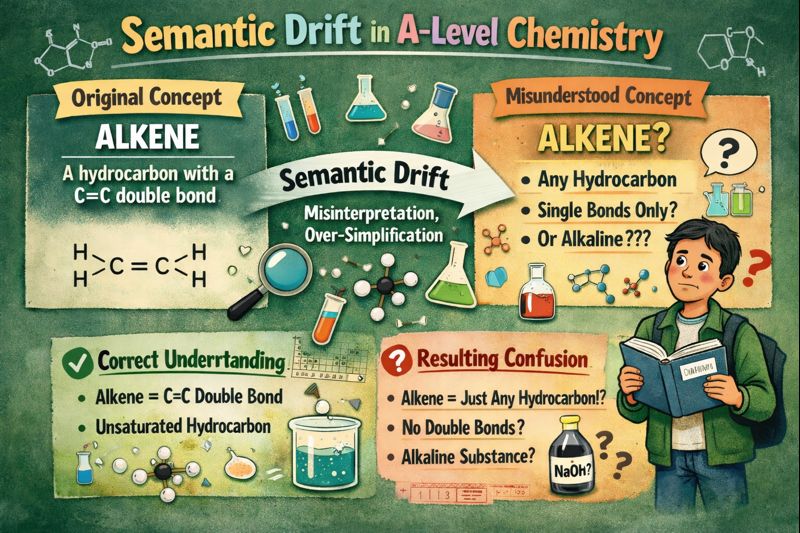 Semantic drift arises when words have multiple context-dependent meanings. In chemistry, many terms — reaction, dissolve, equilibrium, concentration, and energy exist in common language with different connotations than in scientific usage. When students bring familiar meanings into chemistry contexts without reconciling them with technical definitions, they risk building conceptual misunderstandings that interfere with deeper learning (RSC Education, Avoid the pitfalls of language).(edu.rsc.org)
